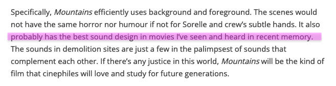 Excerpt from "In the Seats" review of Mountains at the 2023 Toronto International Film Festival, written by Paolo Kagaoan. Image links to full review.